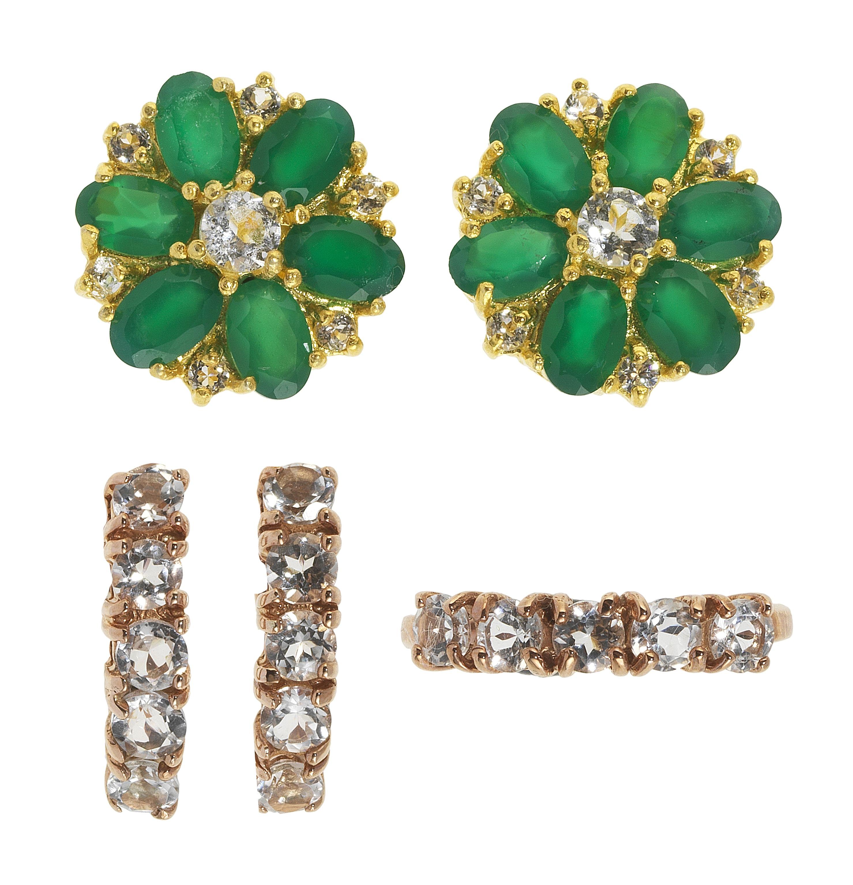 Argent rosé 925, doigt 52-12. On joint une paire de clous d'oreilles fleur sertis de topazes blanches entourées d'agates vertes, vermeil 925, D 1,5 cm. Pour les lots précédés d'un *, la TVA de 7,7% est due sur l'entier du prix d'adjudication.