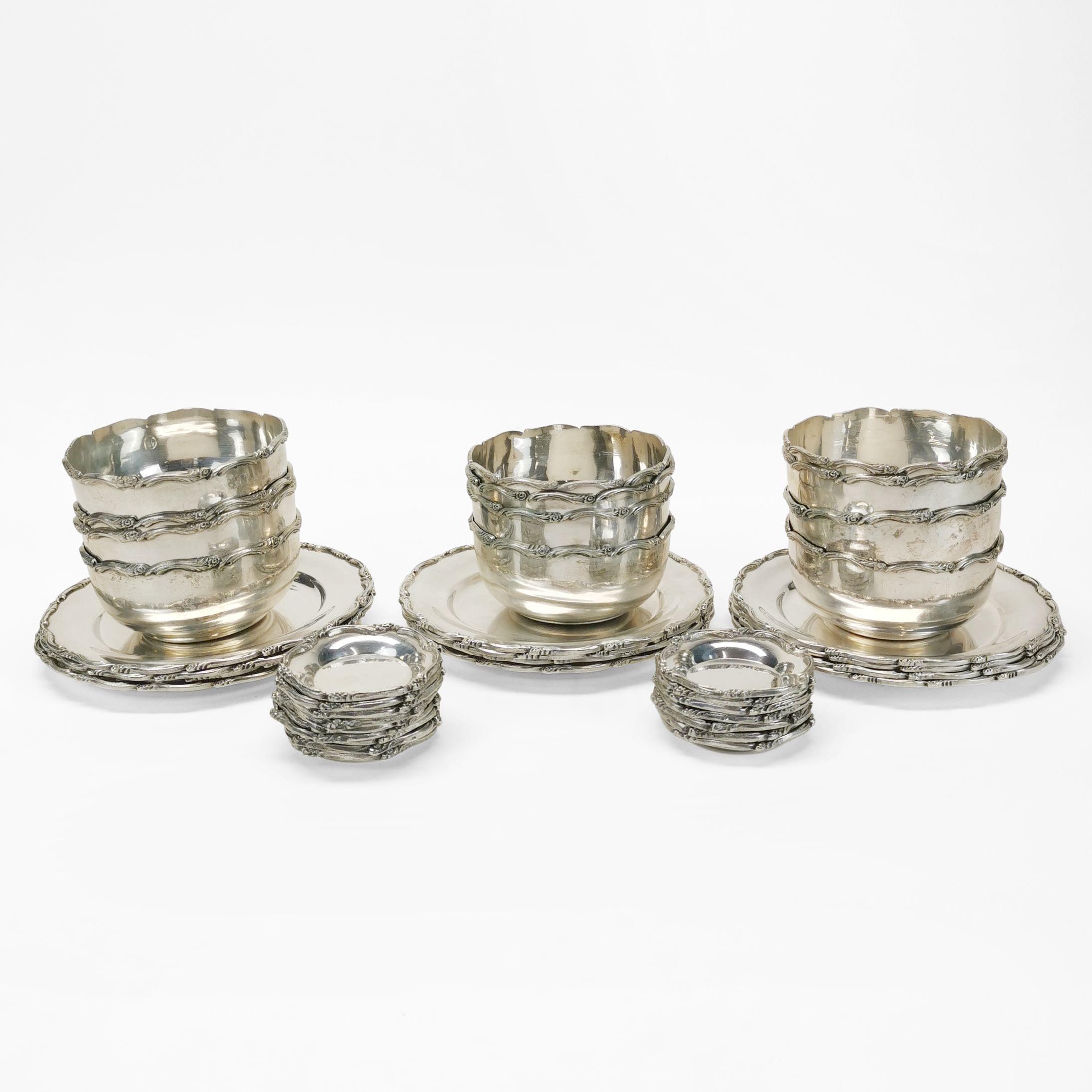 3864. Ensemble de 12 assiettes à pain, 12 bols et 16 coupelles à bordure de volutes