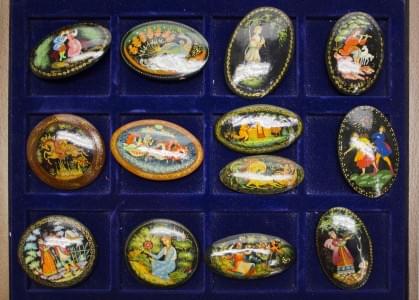 Papier mâché laqué à décor de sujets mythologiques et populaires russes, L 7 cm