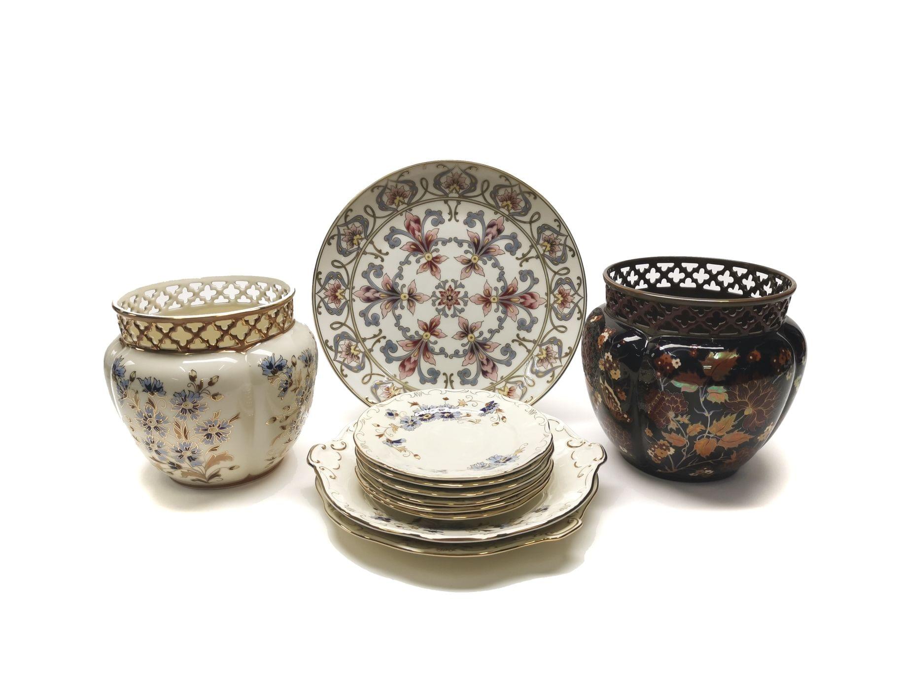 3539. Ensemble de 2 cache-pots, 3 plats et 6 assiettes à décor de fleurs