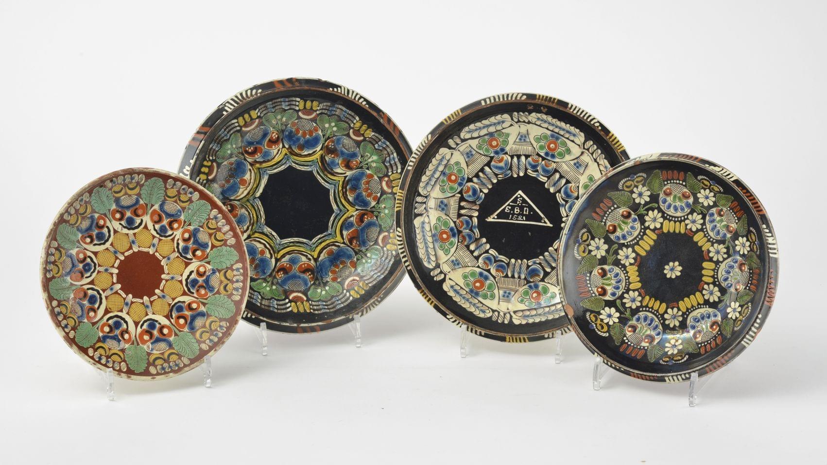 Terre vernissée à décor incisé tournant de motifs végétaux, émaux polychromes, fond brun ou roux, deux signées "S EBO 1521".