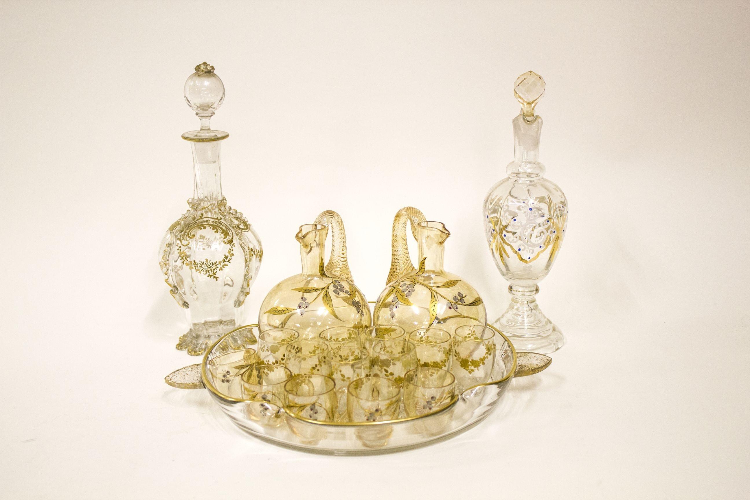 3437. Ensemble de 4 carafes, 13 petits verres et 1 plateau à décor émaillé et or de branches fleuries, guirlandes ou rinceaux