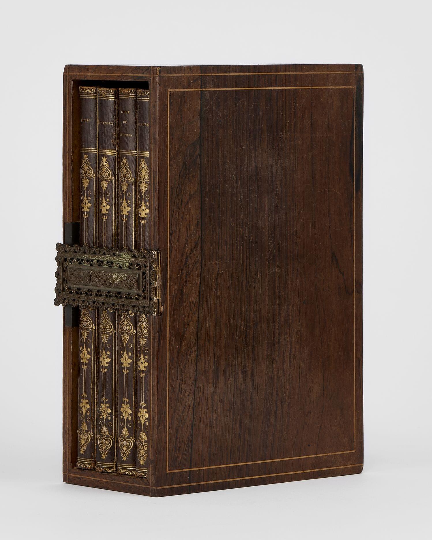 3732. Ensemble de 4 recueils manuscrits vers 1830: Notes, Souvenirs, Copie de Lettres et Contes, soit 4 vol. in 8°, demi maroquin brun orné réuni dans un coffret en palissandre, fermoir en laiton.