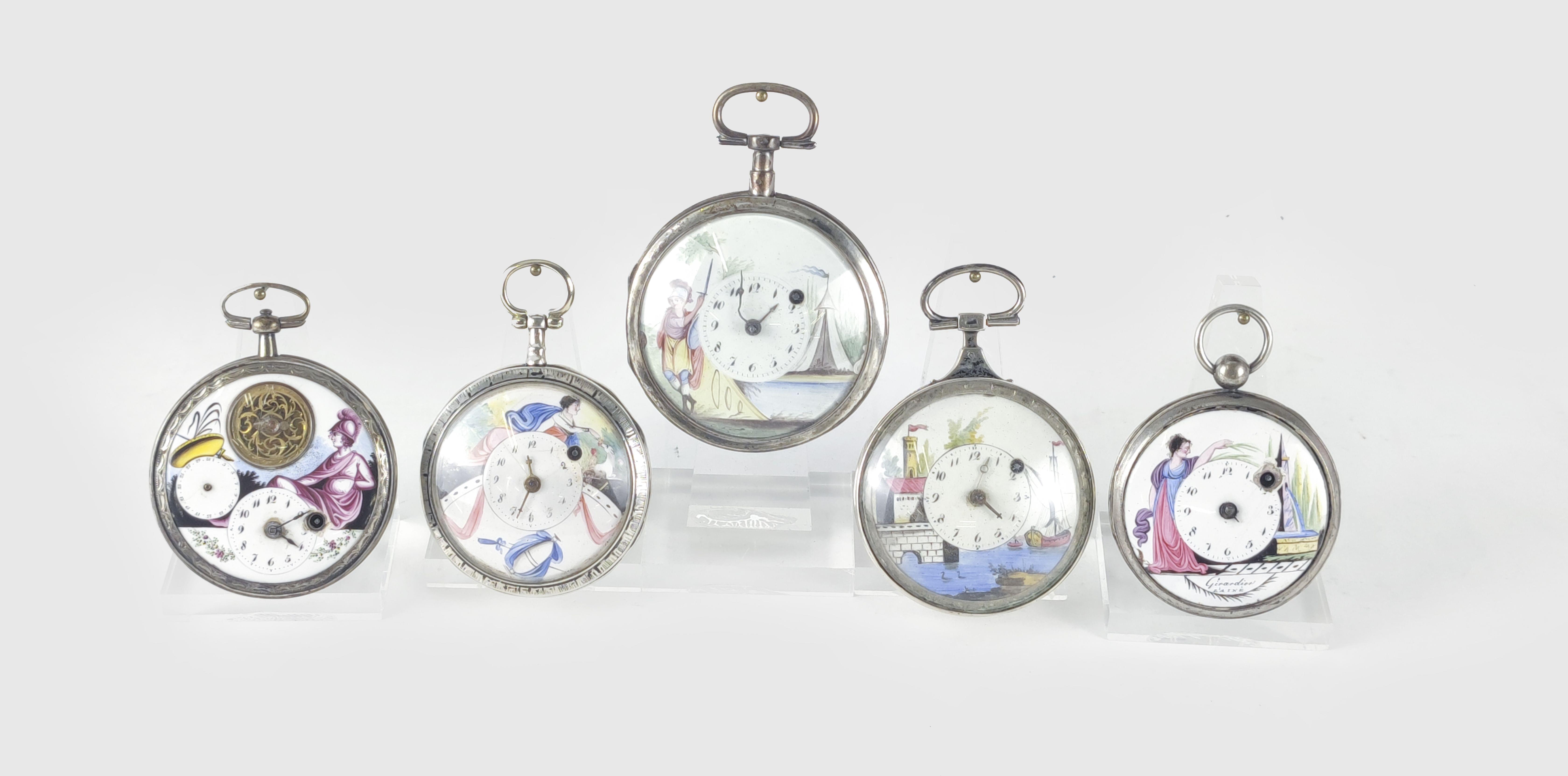 Cadrans peints de diverses figures allégoriques ou scènes de paysage, D env 50 mm. Provenance: Collection en Suisse d'une famille franco-italienne.
