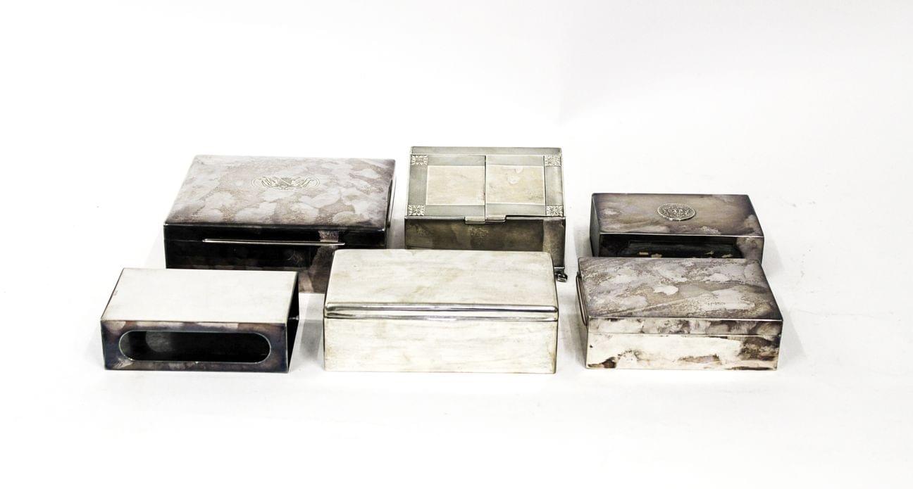 3342. Ensemble de 6 boîtes à cigarettes et allumettes, l'une ornée d'une pièce genevoise, une autre gravée d'armoiries