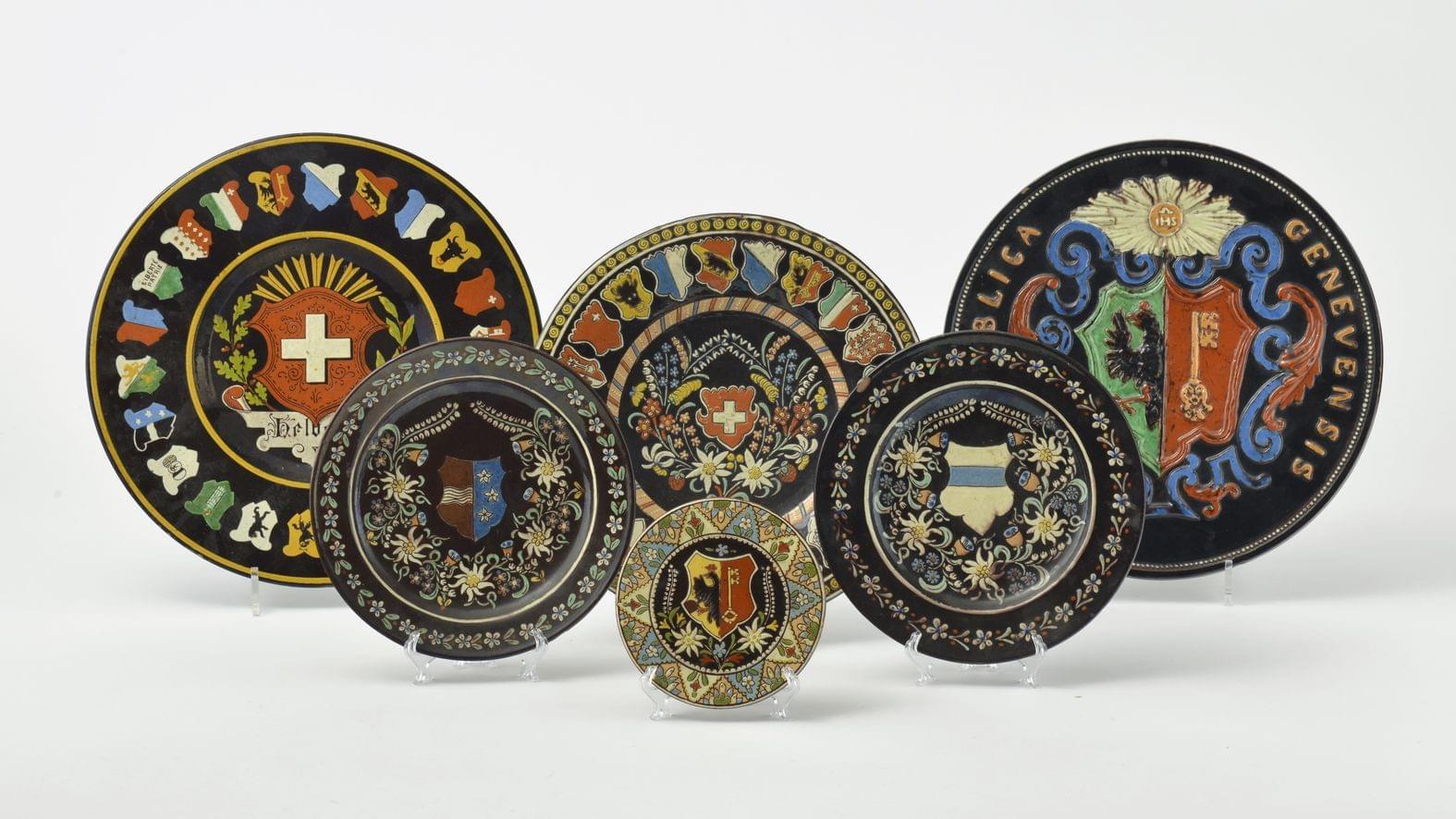 Terre vernissée à décor central aux armes des différents cantons suisses (Genève, Argovie, Zug, etc), fond brun, signature "Thoune" et "Thoune Johann Wanzenried".