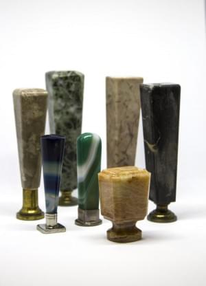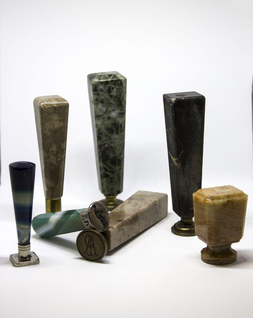 44. 9 sceaux-cachets marbre, calcédoine, sodalite, jaspe et pierres...
