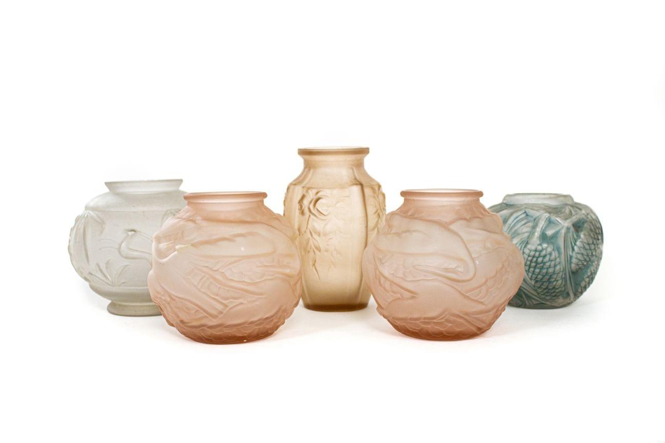 Verre dépoli, à décor d'oiseaux, fleurs, cygnes et scène de chasse, H de 15 à 22 cm
