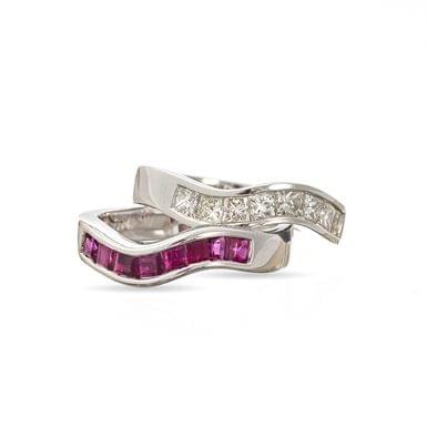 129. Ensemble de deux alliances vagues, l'une sertie de rubis taille princesse (env. 1 ct), l'autre sertie de diamants taille princesse (env. 1 ct)