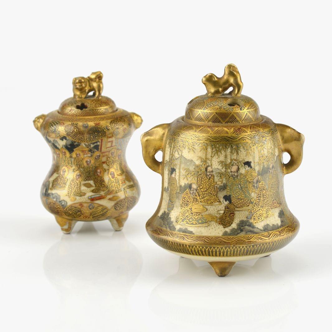 Céramique émaillée polychrome à décor de personnage sur fond or, Japon, Satsuma, fin époque Meiji, H 12 et 10 cm