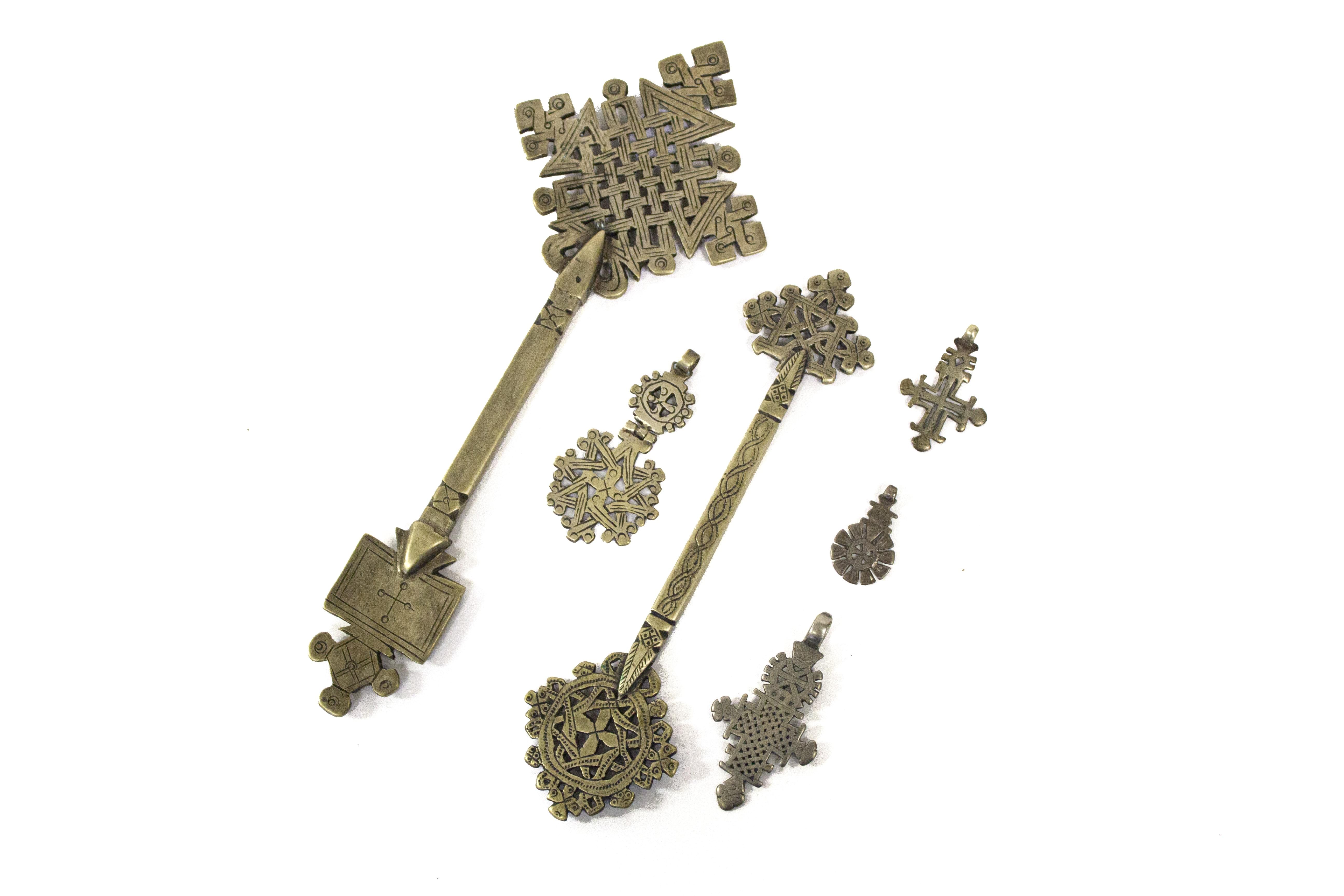 3520. Ensemble de deux croix et quatre pendentifs coptes, Éthiopie