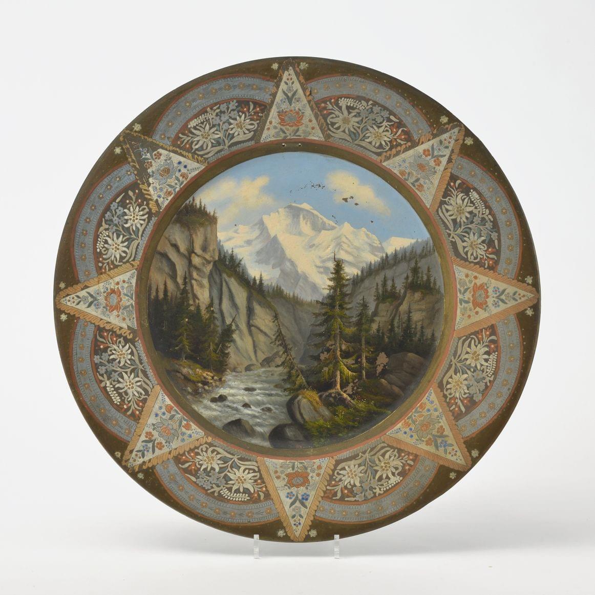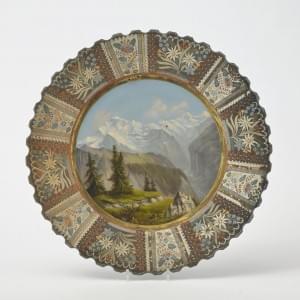 Terre vernissée à décor incisé de fleurs, centre peint de bords de lacs suisses notamment la chapelle de Tell et Chillon, Thoune XIXe s, D 61 cm