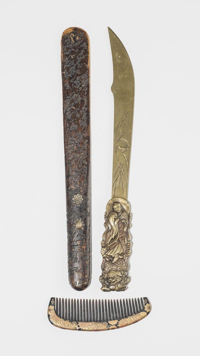 Un en bois à décor d'insecte en bronze doré, l'autre en métal avec le manche formé d'un personnage debout sur un shi-shi, on y joint un peigne en laque noire à décor de fleurs, Japon, époque Meiji (1868-1912)