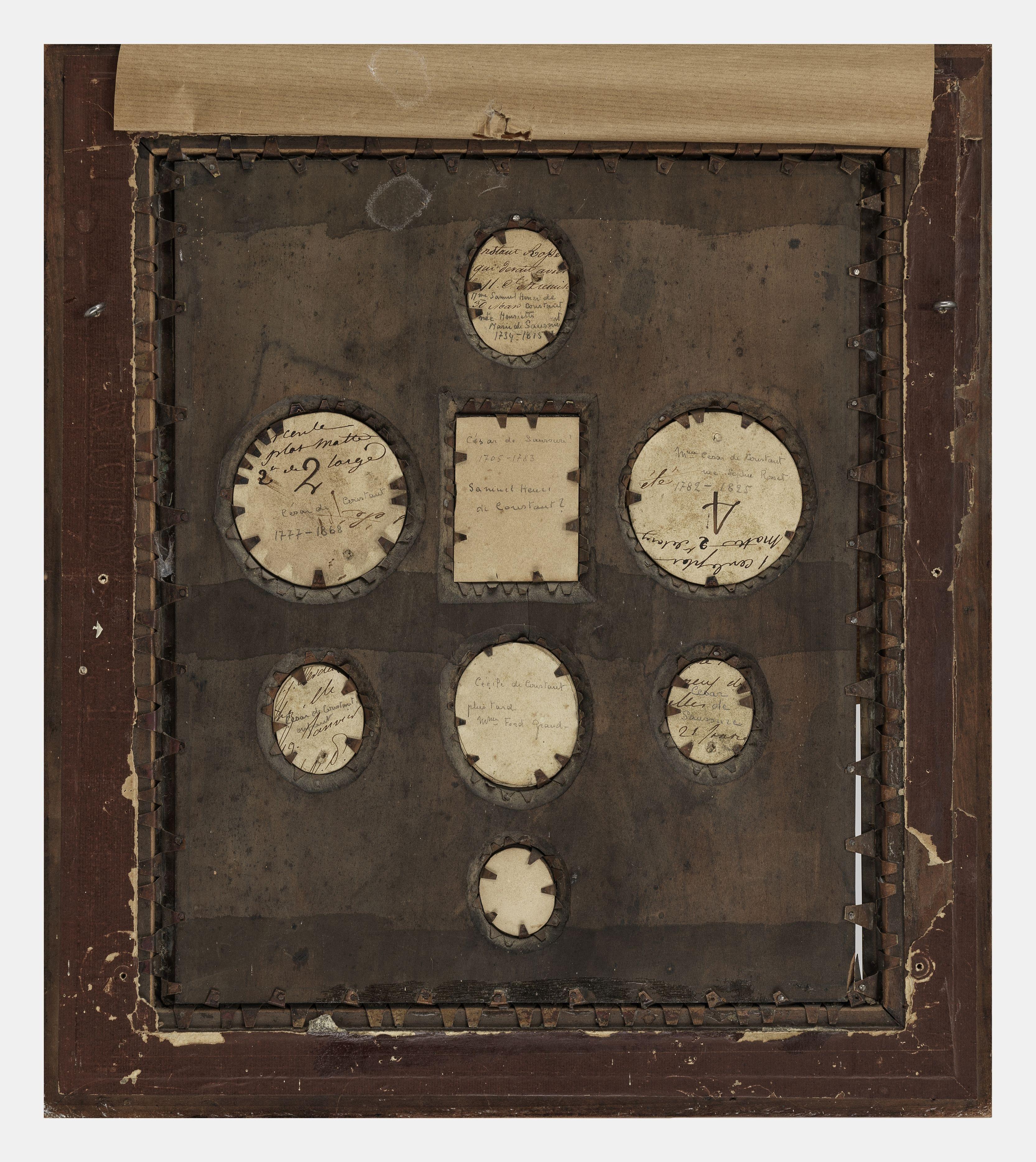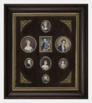 Henriette de Constant-de Saussure, Sophie de Constant-Rosset, Samuel de Contant, César de Constant, César de Saussure, Cécile Grand-de Constant, César de Constant, gouache sur ivoire, XVIIIe-début XIXe s, présentées dans un même cadre néoclassique, 40x36 cm