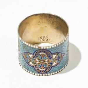 Ensemble de liens de serviette : l'un à décor géométrique en émail cloisonné, Russie, Saint-Petersbourg, 88 zolotniks, 45 g, un autre à décor de médaillons et perlettes en émaux cloisonnés daté 1896, Allemagne, 55 g. On y joint une petite boîte en émaux cloisonnés, Moscou