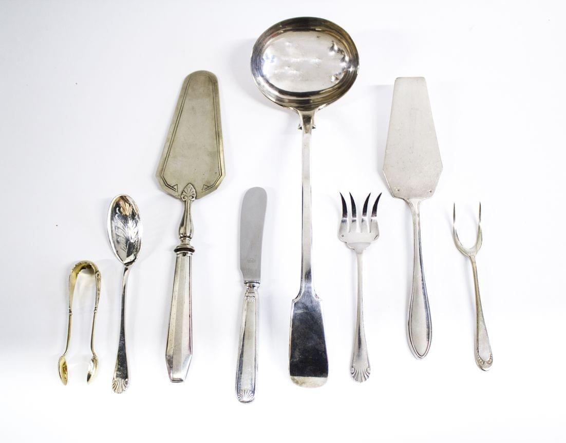 3338. Ensemble de pièces de service en métal argenté, comprenant : louche, pince à sucre, deux pelles à tarte, couteau à beurre, service à olives