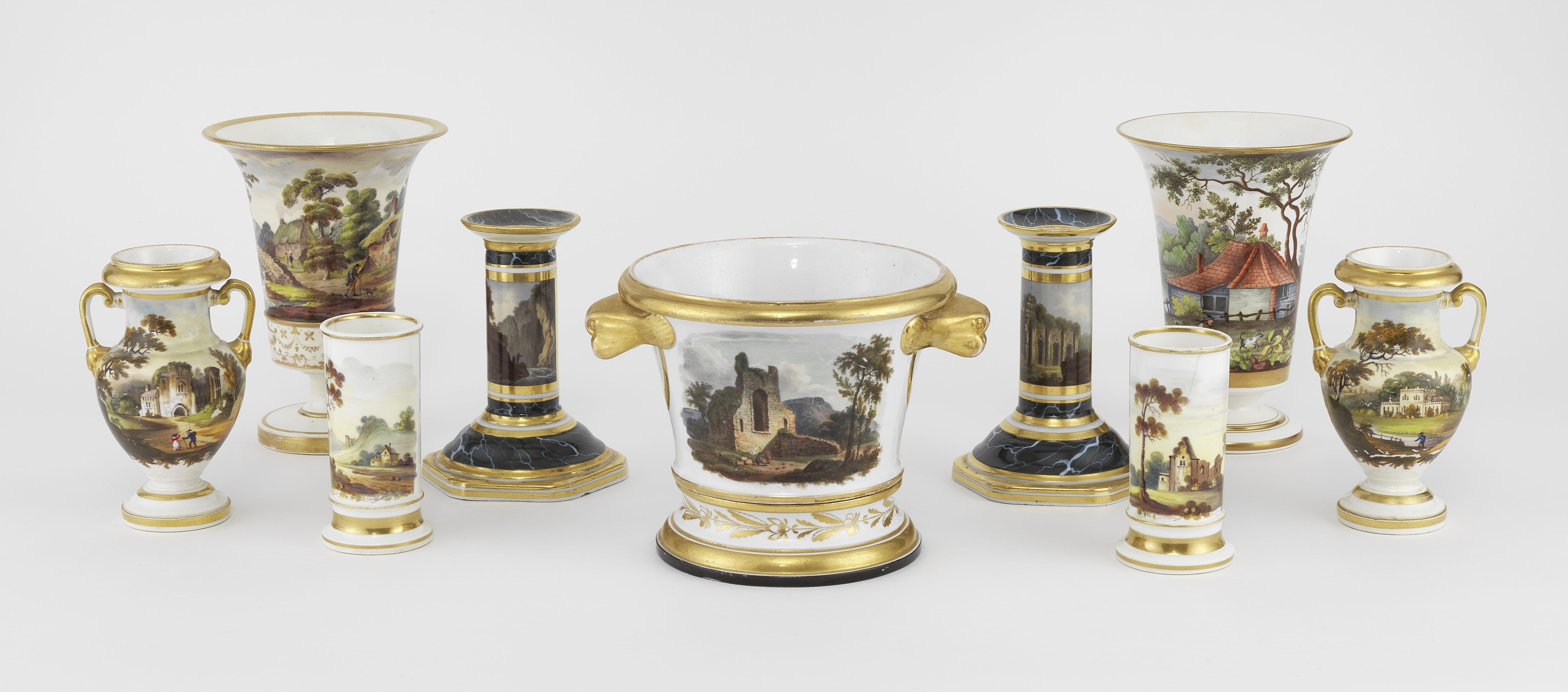 4368. Ensemble de pièces en porcelaine de Paris blanche et or à décor polychrome de paysages romantiques
