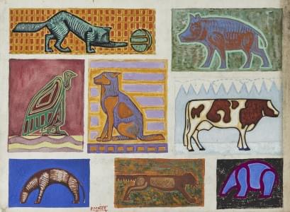 Animaux et éléments décoratifs, fusain, mine de plomb et aquarel...