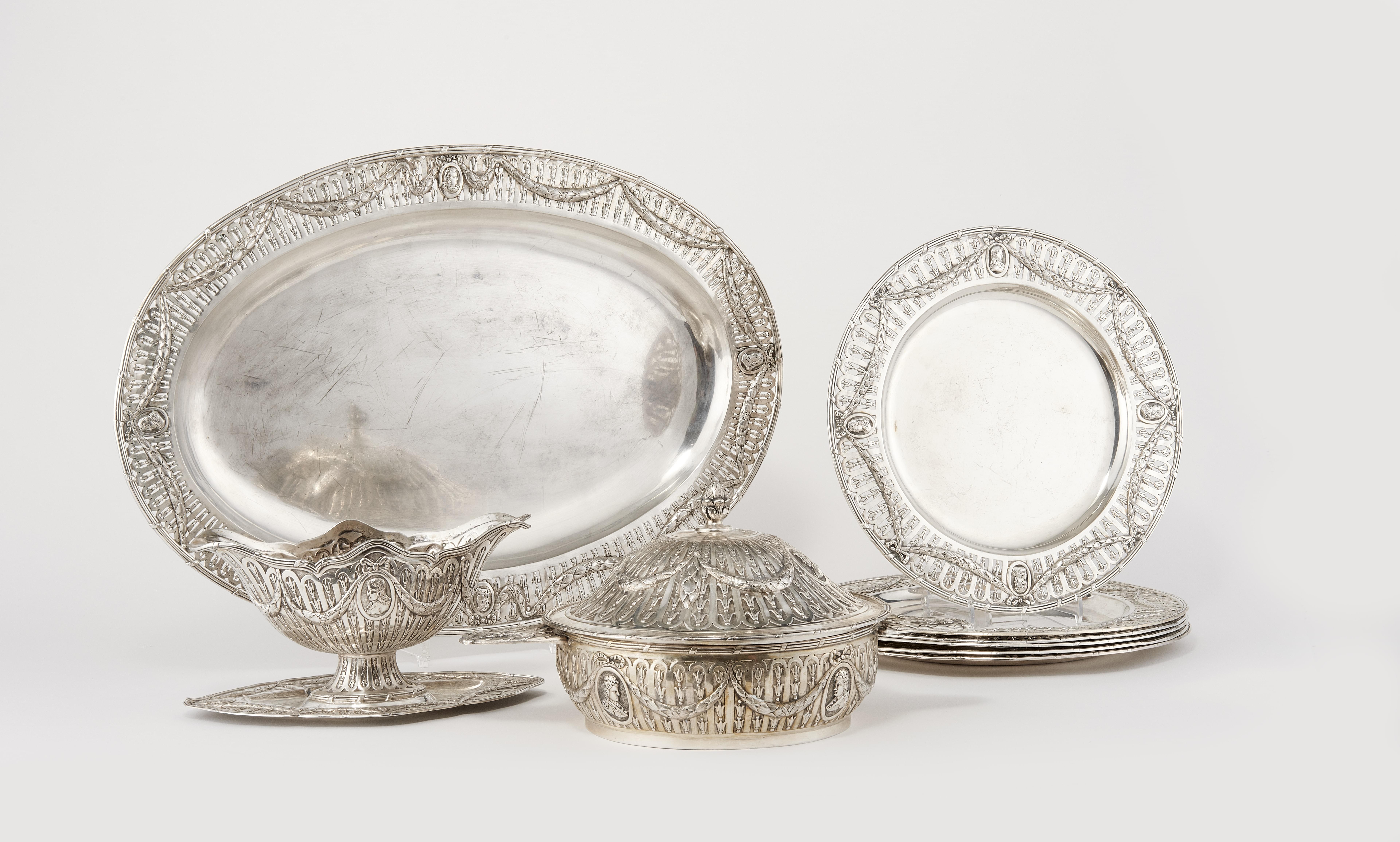 Venise, début XXème s, argent 800, comprenant: 6 assiettes de présentation, un légumier, un plateau ovale et une saucière, 5000g