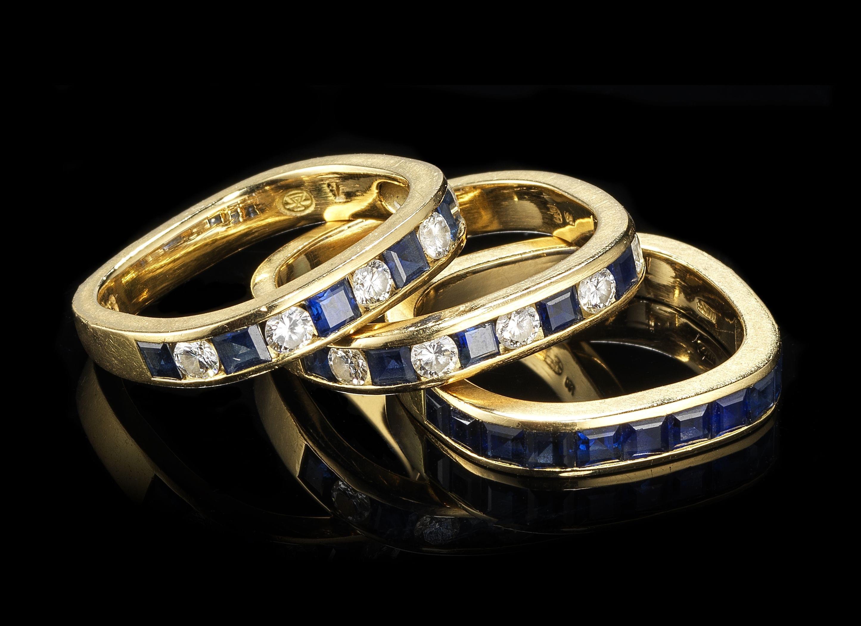 267. Ensemble de trois anneaux sertis de saphirs calibrés, deux d'entre eux alternés de diamants