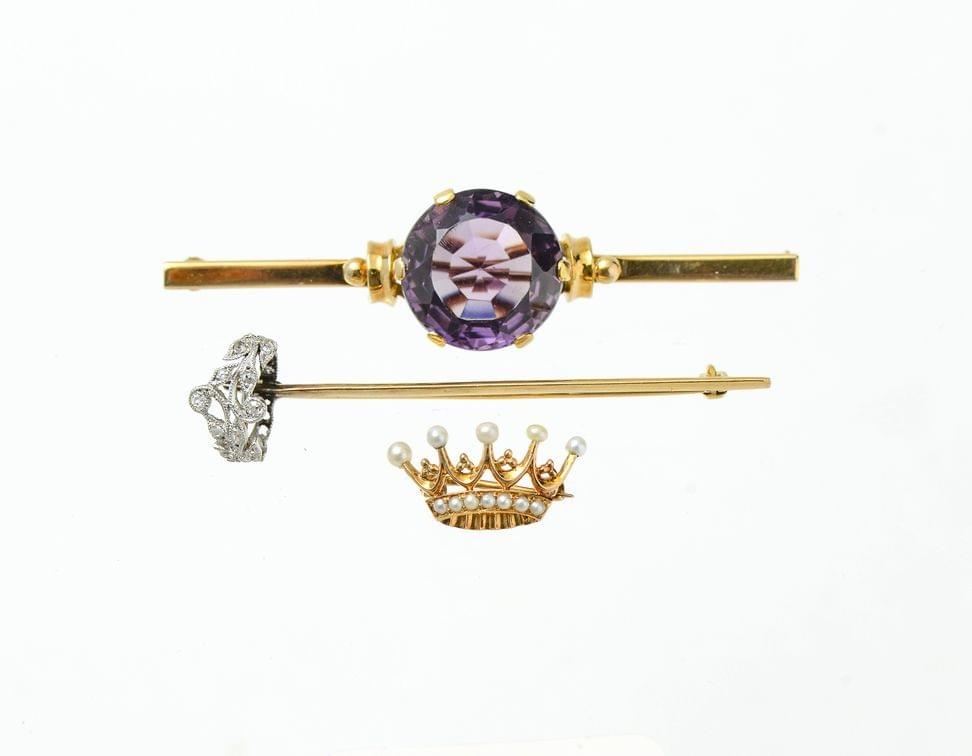 3156. Ensemble de trois broches, l'une sertie d'une améthyste, l'une formant une couronne sertie de perles et l'une portant un motif serti de roses de diamant