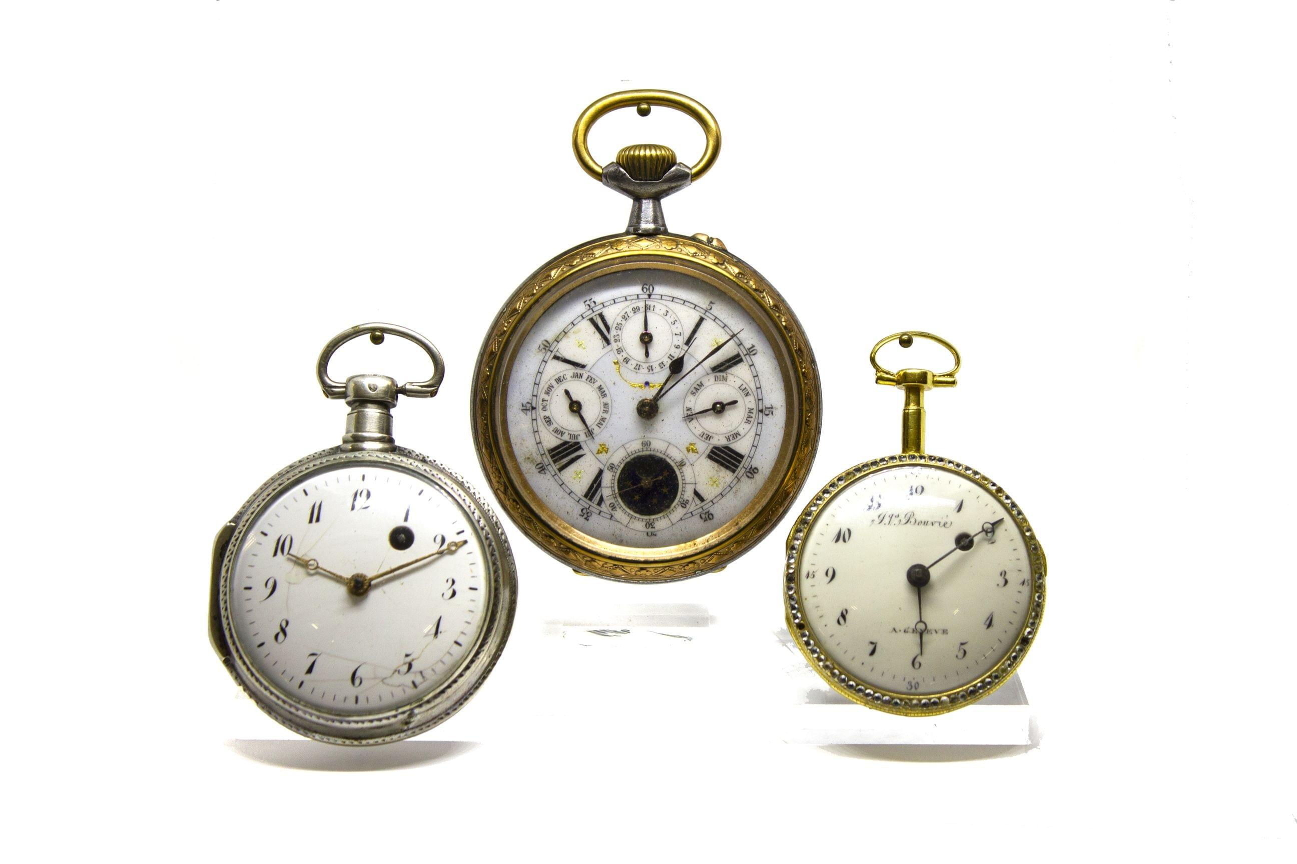 L'une à cadran blanc émaillé, aiguilles et chiffres romains noirs, quatre cadrans pour les phases de la Lune et les secondes, le mois, la date et le jour de la semaine, acier, D env. 65 mm, l'une à cadran blanc émaillé, aiguilles dorées, chiffres arabes noirs, signée E. Bomset à Belfort, argent, D env. 55 mm, et l'une signée J.V. Bouvié à Genève à décor émaillé de scène galante, cadran crème, aiguilles et chiffres arabes noirs, serti de pierres d'imitation, métal doré, D env. 50 mm.