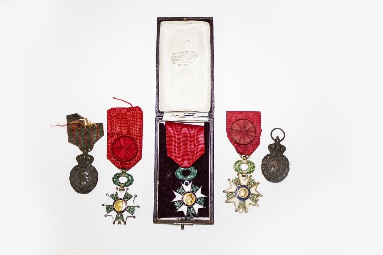 4026. Ensemble de trois Ordres nationaux de la Légion d'honneur et deux Médailles de Sainte-Hélène