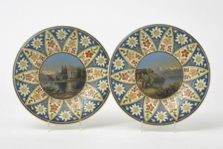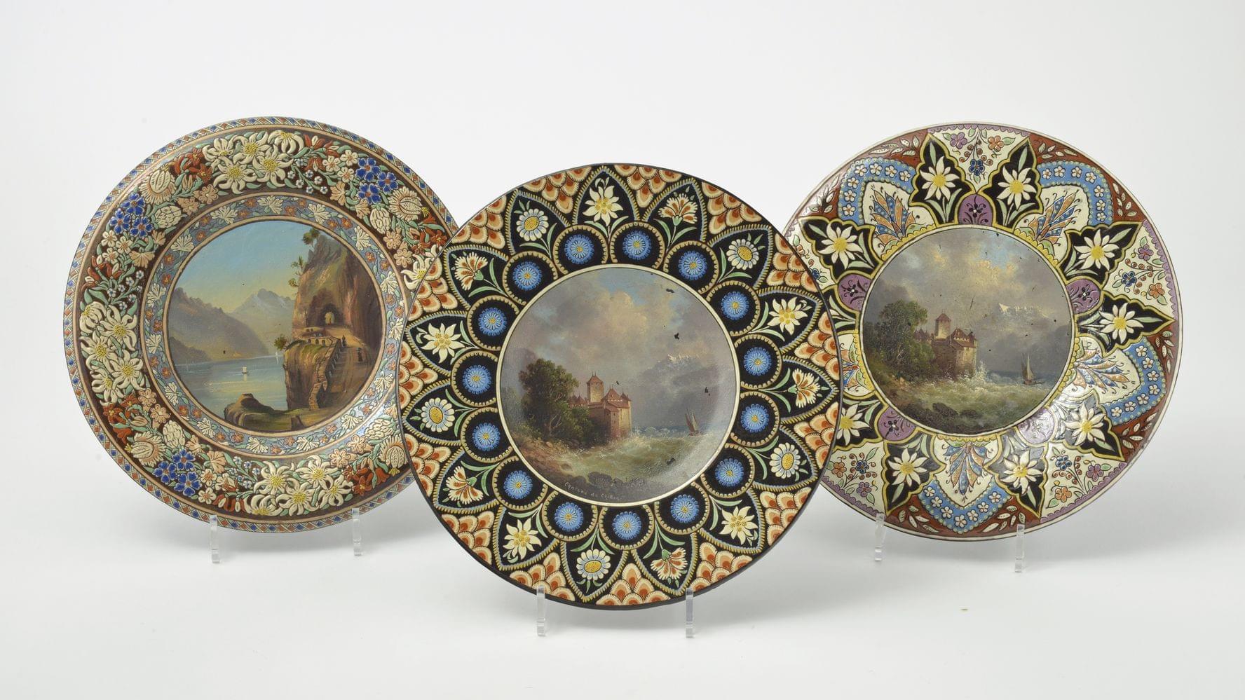 Terre vernissée à décor incisé de fleurs, centre peint de bords de lacs suisses notamment le château de Chillon, Thoune XIXe s, D 31 cm