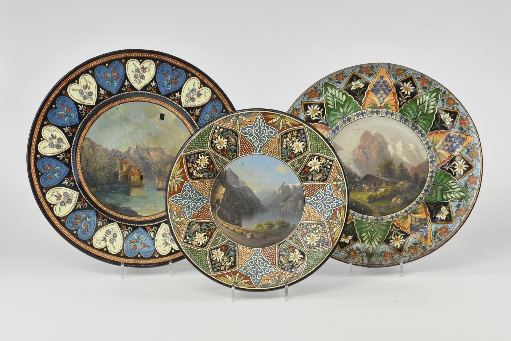 Terre vernissée à décor incisé de fleurs, centre peint de vues des Alpes, notamment le Wetterhorn et le château de Chillon, Thoune XIXe s, D 35 à 46 cm
