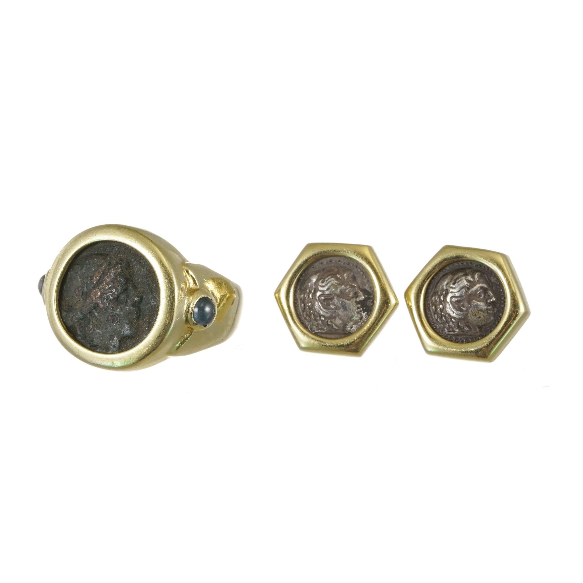3342. Ensemble d'une bague et d'une paire de boucles d'oreilles serties de pièces anciennes