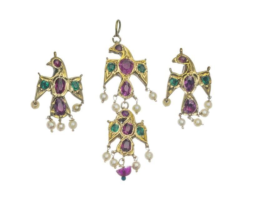 268. Ensemble d'une paire de boucles d'oreilles et d'un pendentif à motif d'oiseaux sertis de rubis et d'émeraudes et retenant des perles en pendeloque