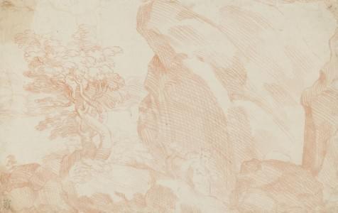 Paysage aux rochers, sanguine, ancienne étiquette au dos avec ré...