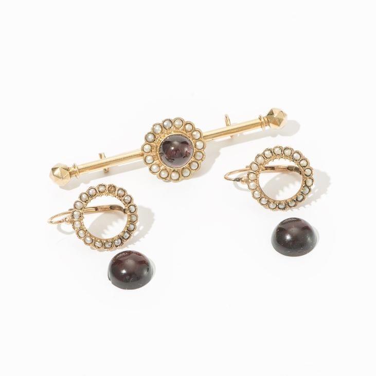 3178. Epingle sertie d'un grenat almandin entouré de perles. On joint une paire de dormeuses du même modèle, pierres imitation grenat desserties.