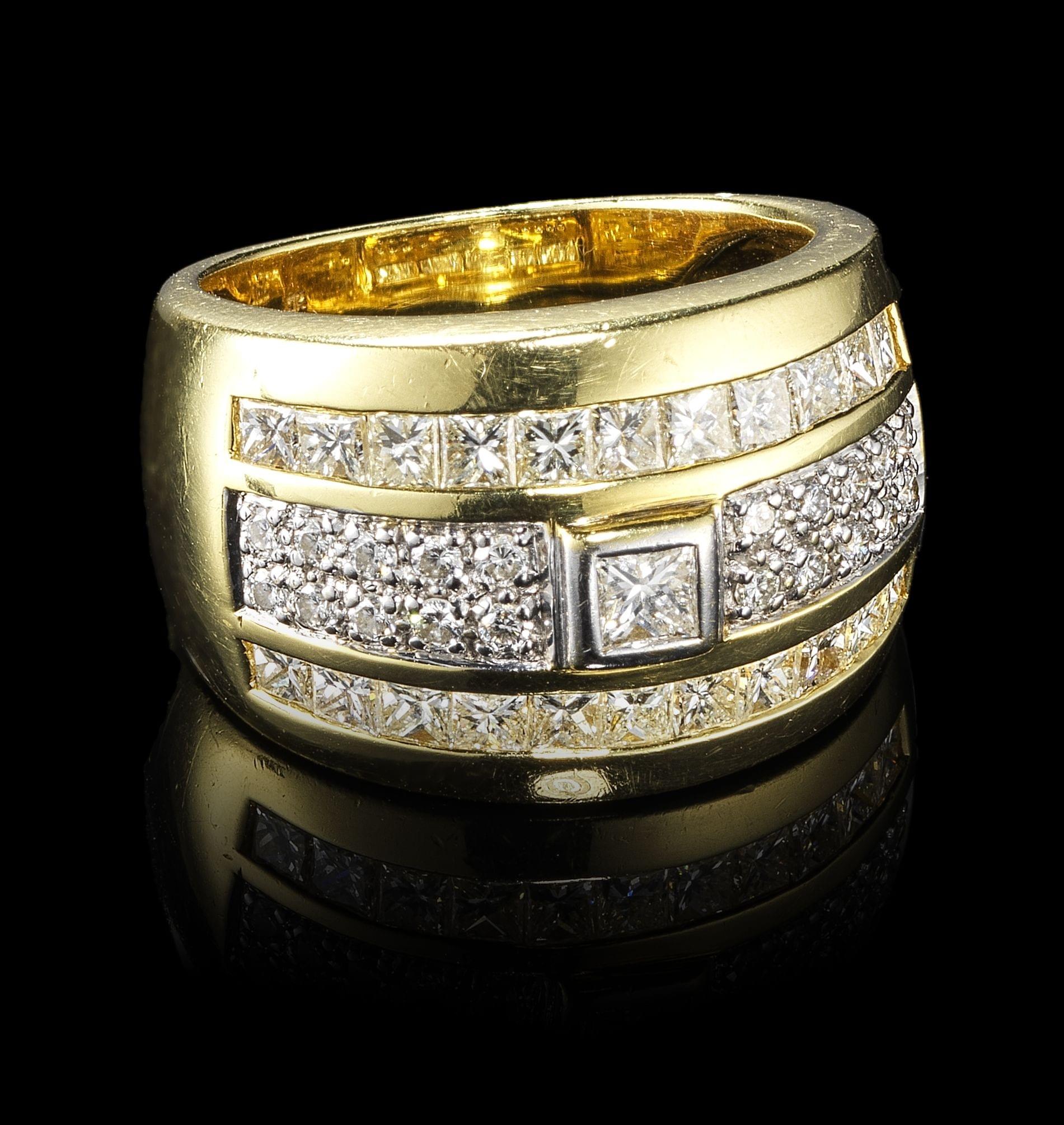 303. Eric Bertrand, attrib. à, bague bandeau cintrée d'un diamant taille princesse épaulé et rehaussé de diamants (env. 1,2 ct)