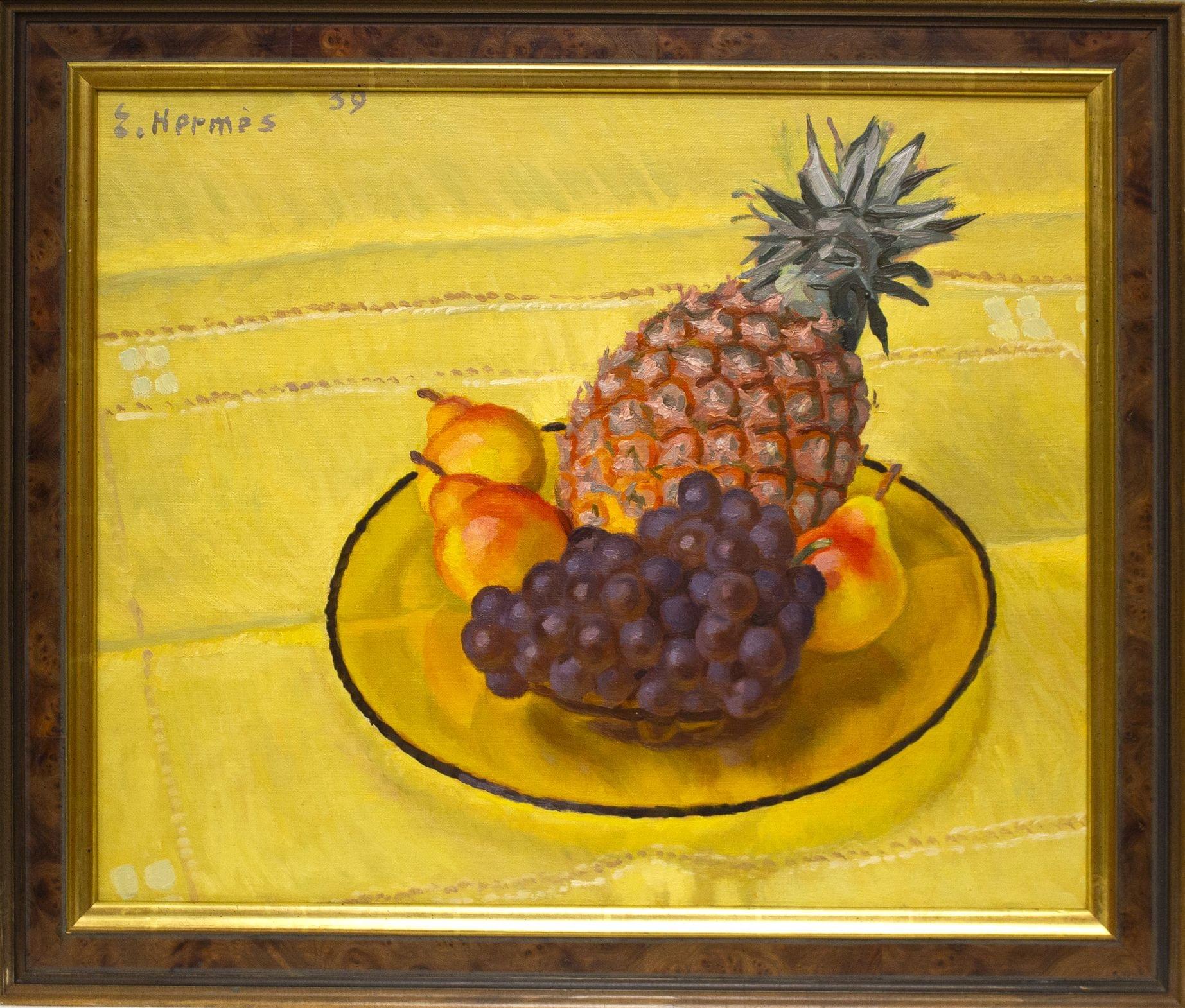 Cuir grainé bleu canard, garniture en métal doré, 24x33x13 cm