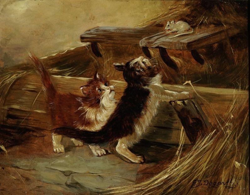 Chats jouant, paire d'huiles sur pavatex, signées 12x16 cm