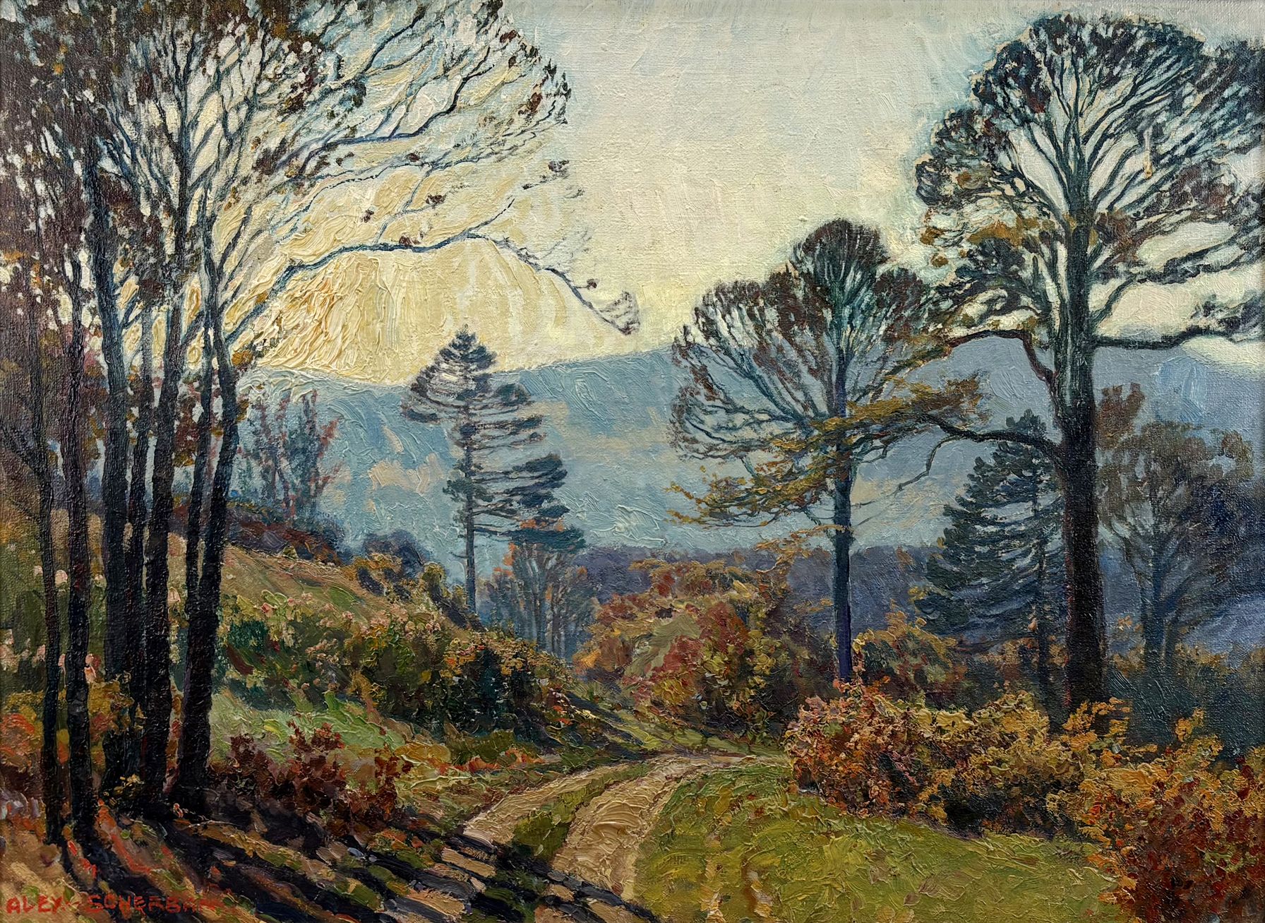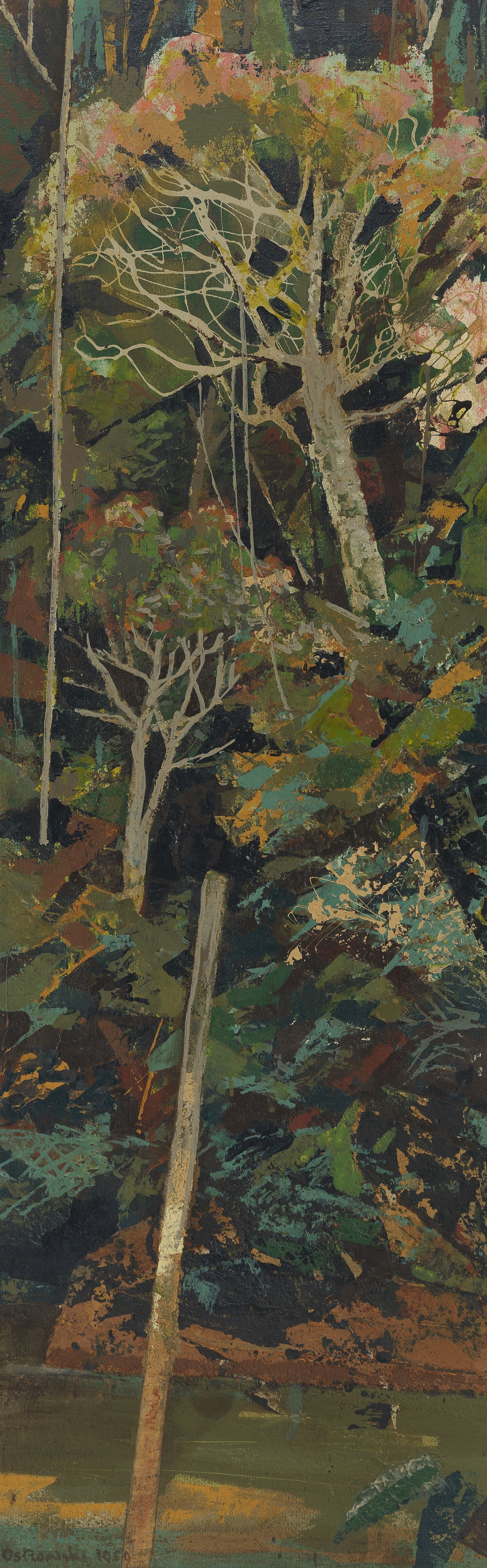 Arbres, huile sur panneau, signée et datée, 1959, 120x 40 cm