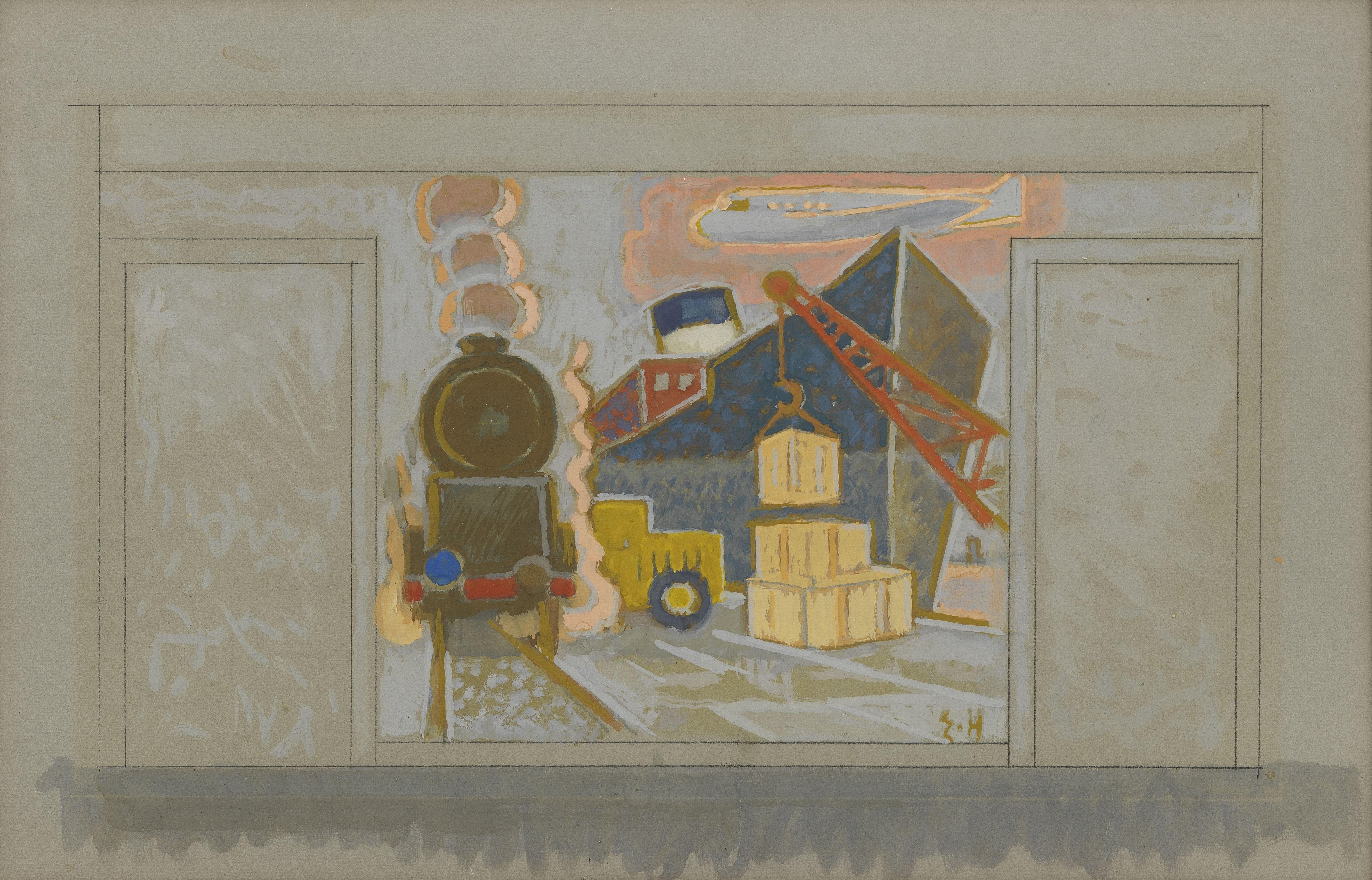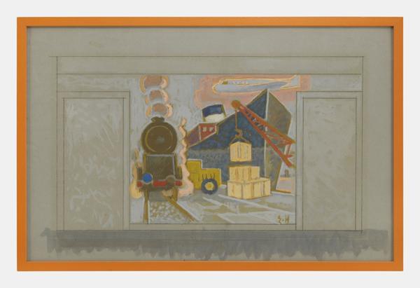 Train et bateau, projet de décor mural, gouache sur papier, monogrammée, 35x55 cm