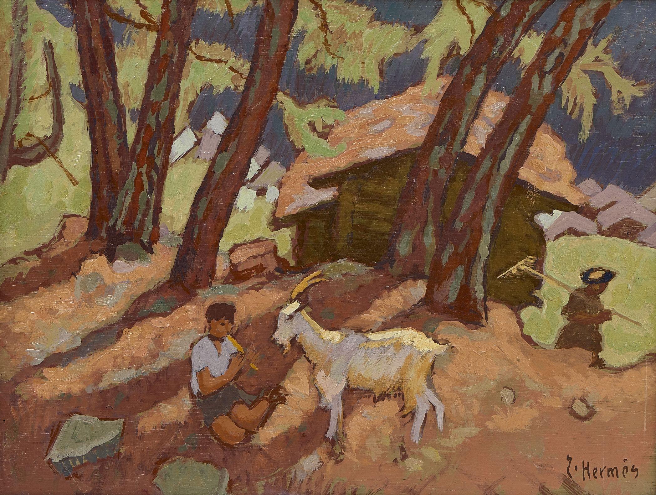 Le pâtre à la flûte et bouquet de fleurs, huile sur panneau double-face, signée, 25x34 cm