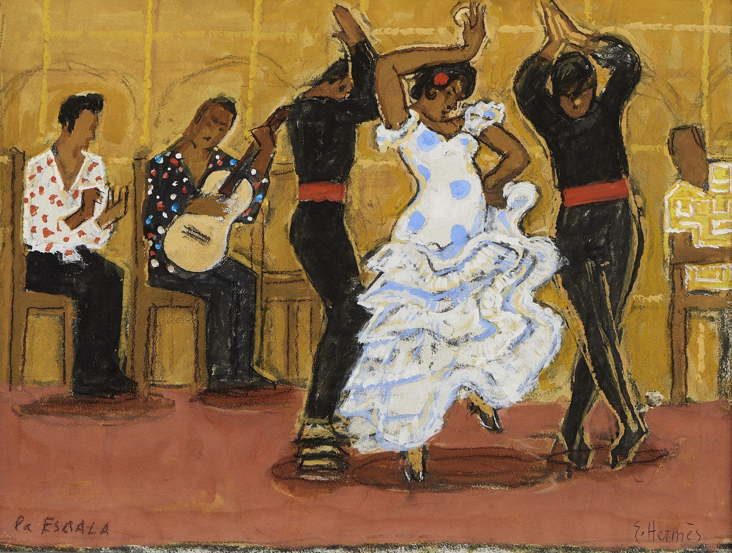 La Escala, les danseurs de flamenco, gouache et fusain sur papier, signé, 29x39 cm