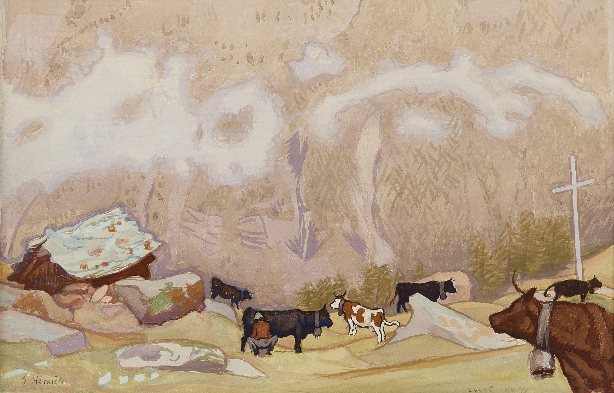 La traite des vaches, Lucel-Arolla, Val d'Hérens, gouache sur papier, signée, 34,5x53 cm