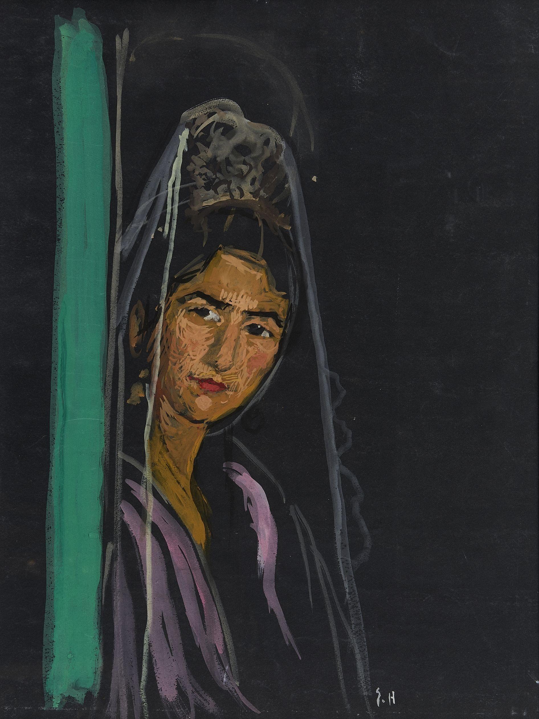 Femme à la mantille, gouache sur papier, monogrammée, 64x49 cm