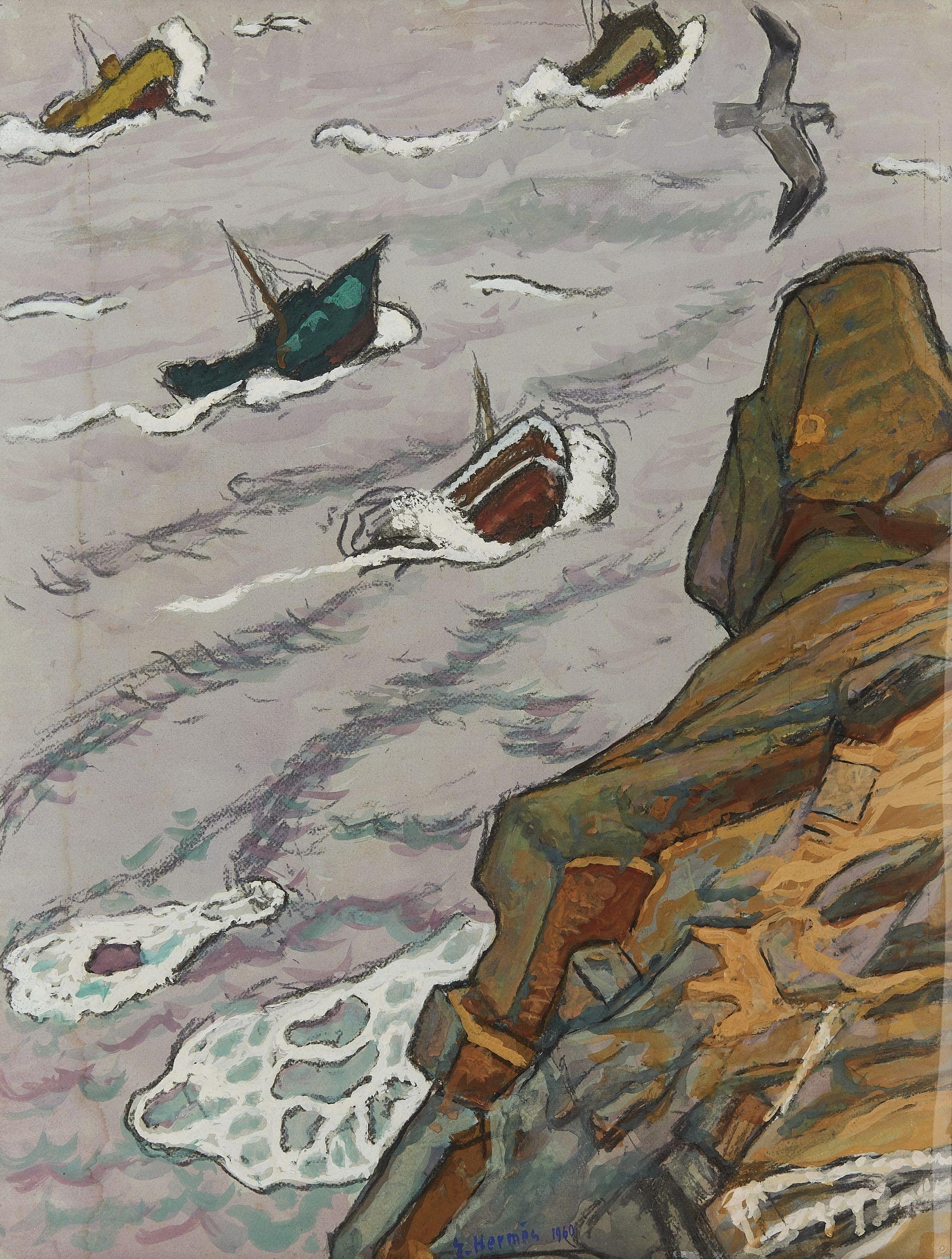 Bord de mer au chalutier, gouache et fusain sur papier, signé et daté 1960, 64x49 cm