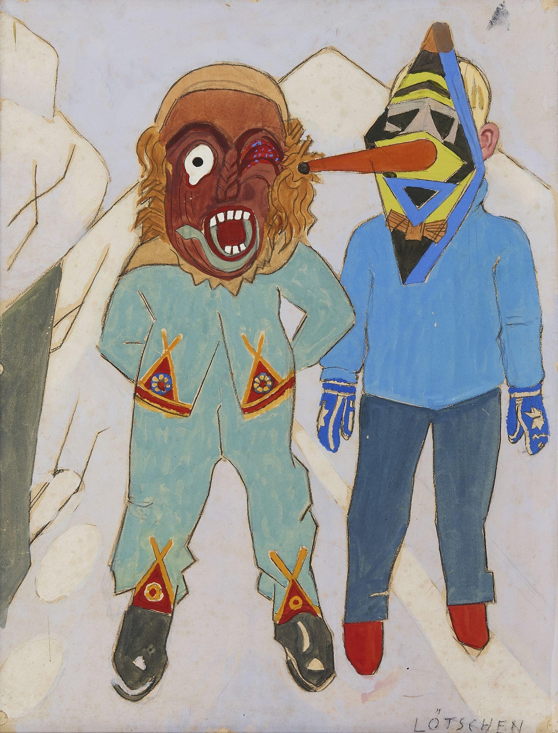Deux Tschäggätta, carnaval au Lötschental, gouache et crayon gras sur papier, non signé, 64x49 cm