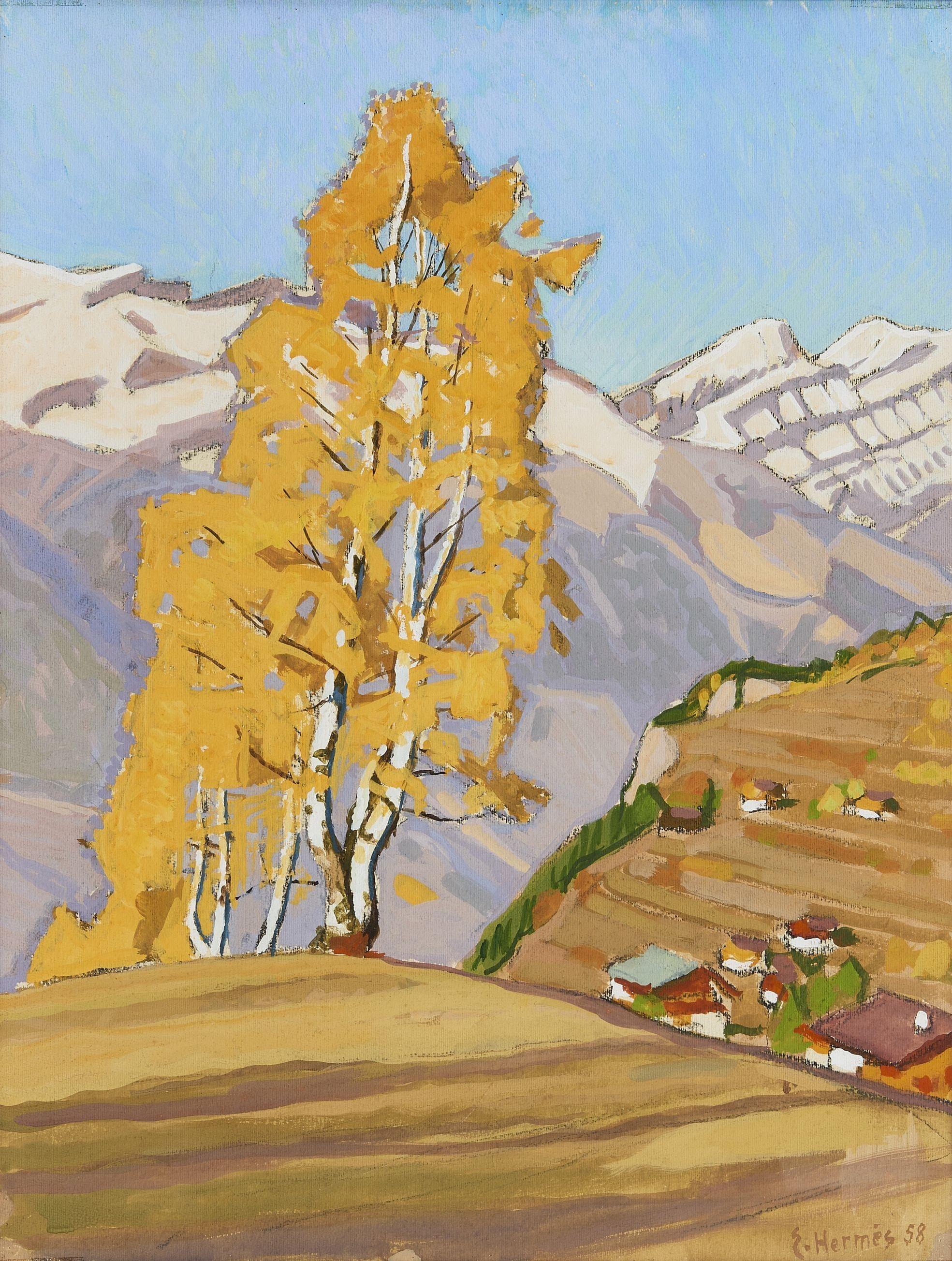 Paysage d'automne, gouache et fusain sur papier, signé et daté 58, 66x49 cm