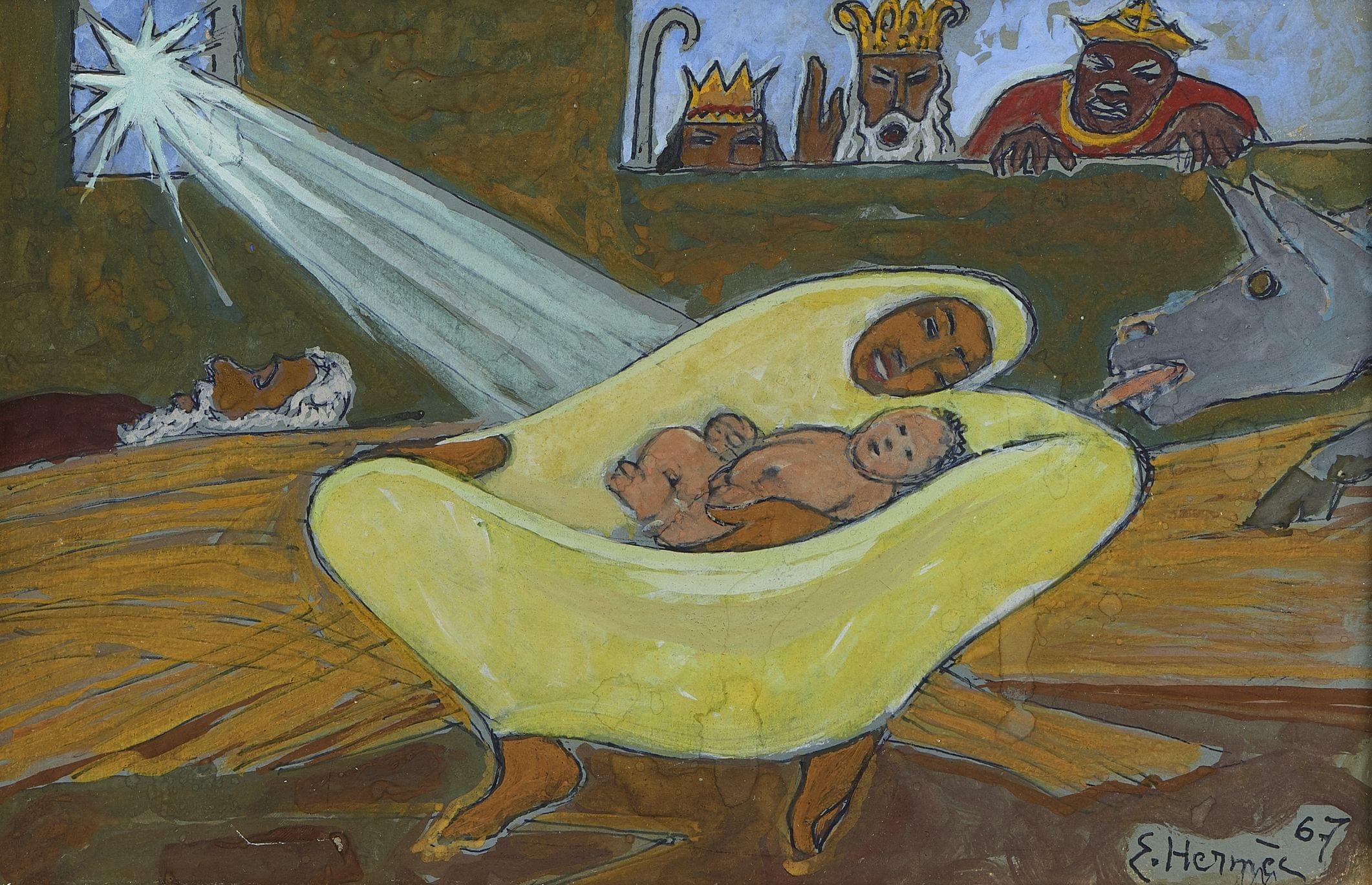 Nativité, gouache et encre sur papier, signée et datée 67, 22x34 cm