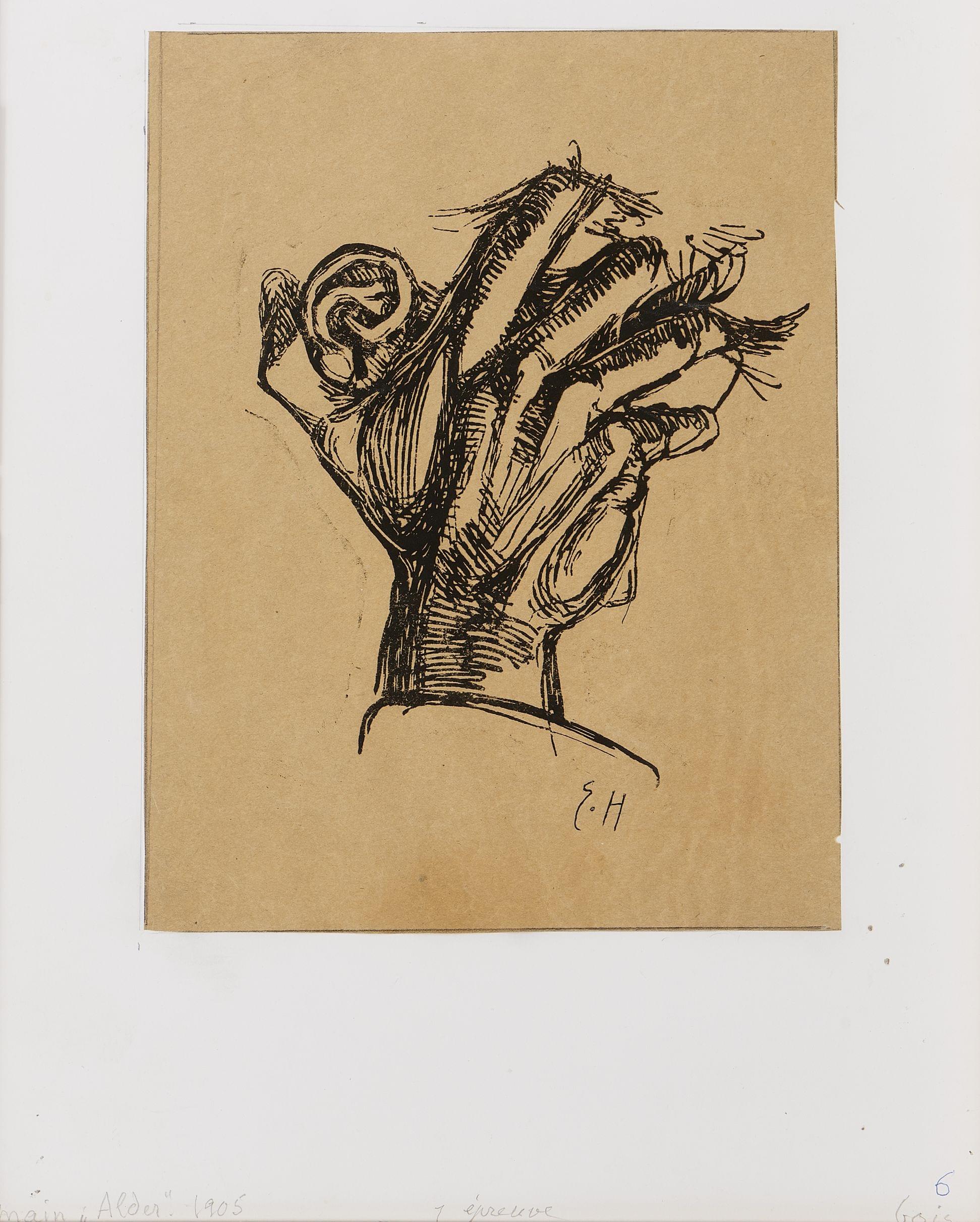 Main de Hans Alder, bois gravé sur papier, monogrammé, signé, 28x21,5 cm