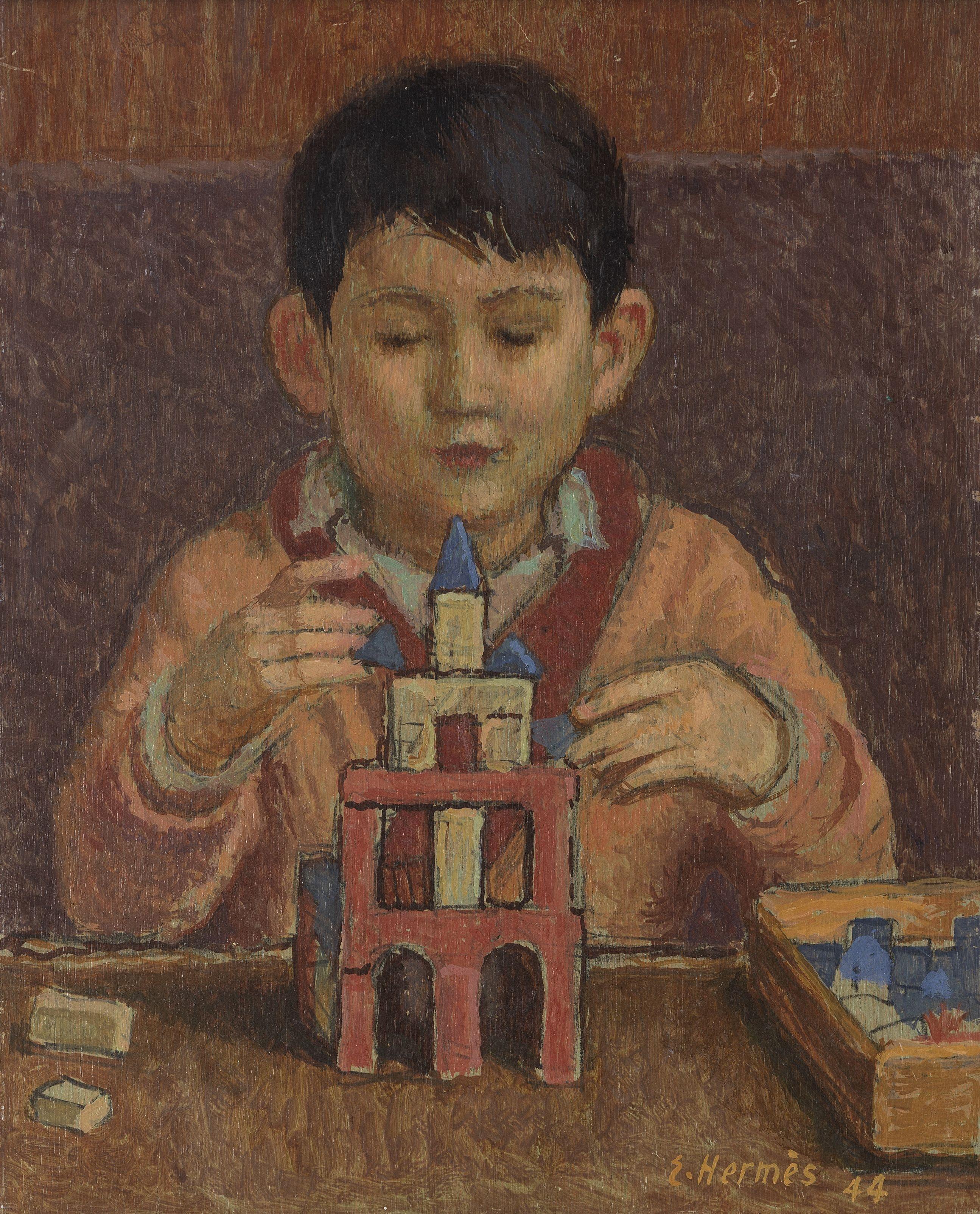 Portrait d'un enfant jouant avec des blocs, huile sur panneau, signée et datée 44, 40x32 cm