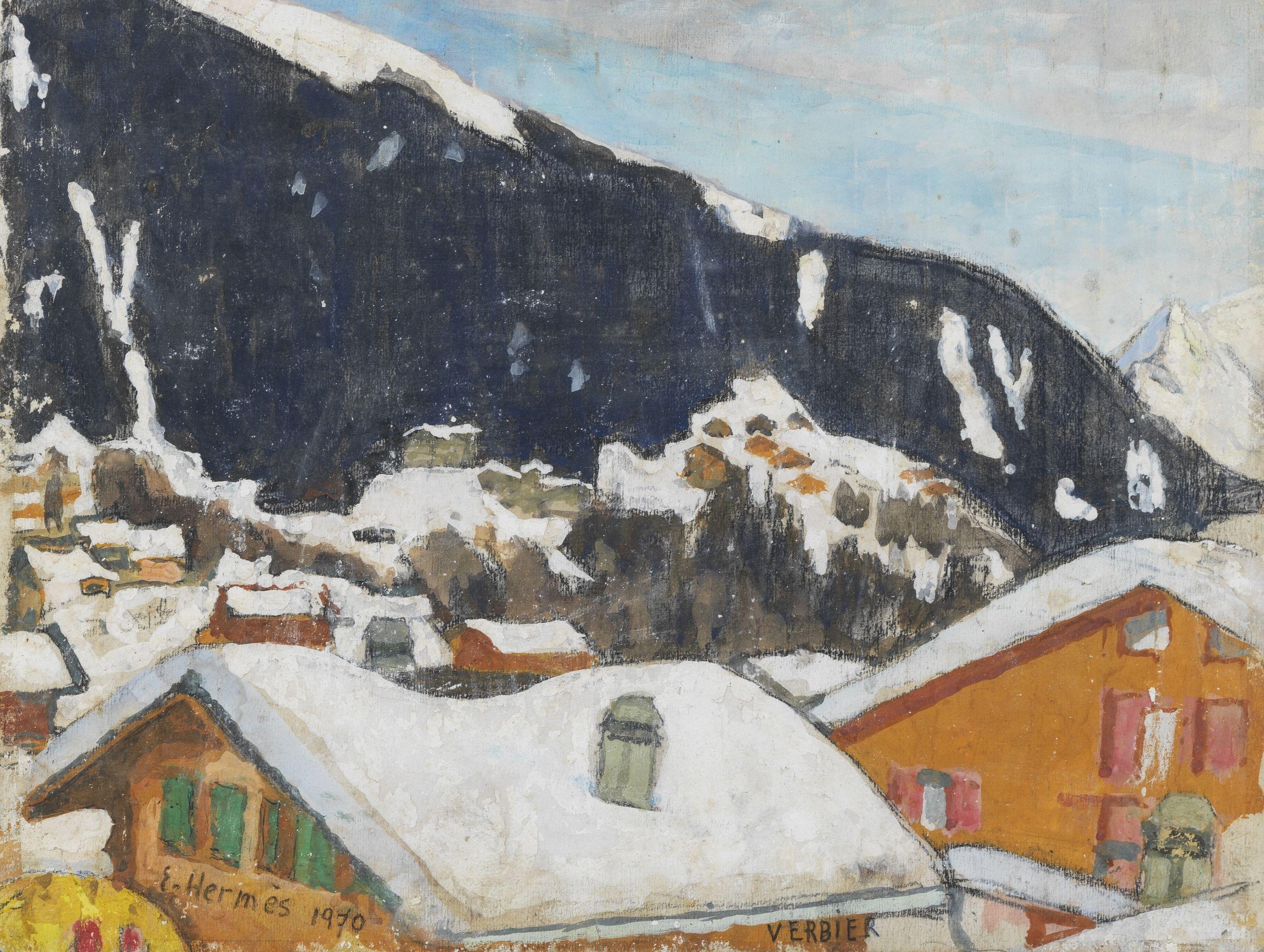 Verbier, fusain et gouache sur papier, signé et daté 1970, 26x33 cm