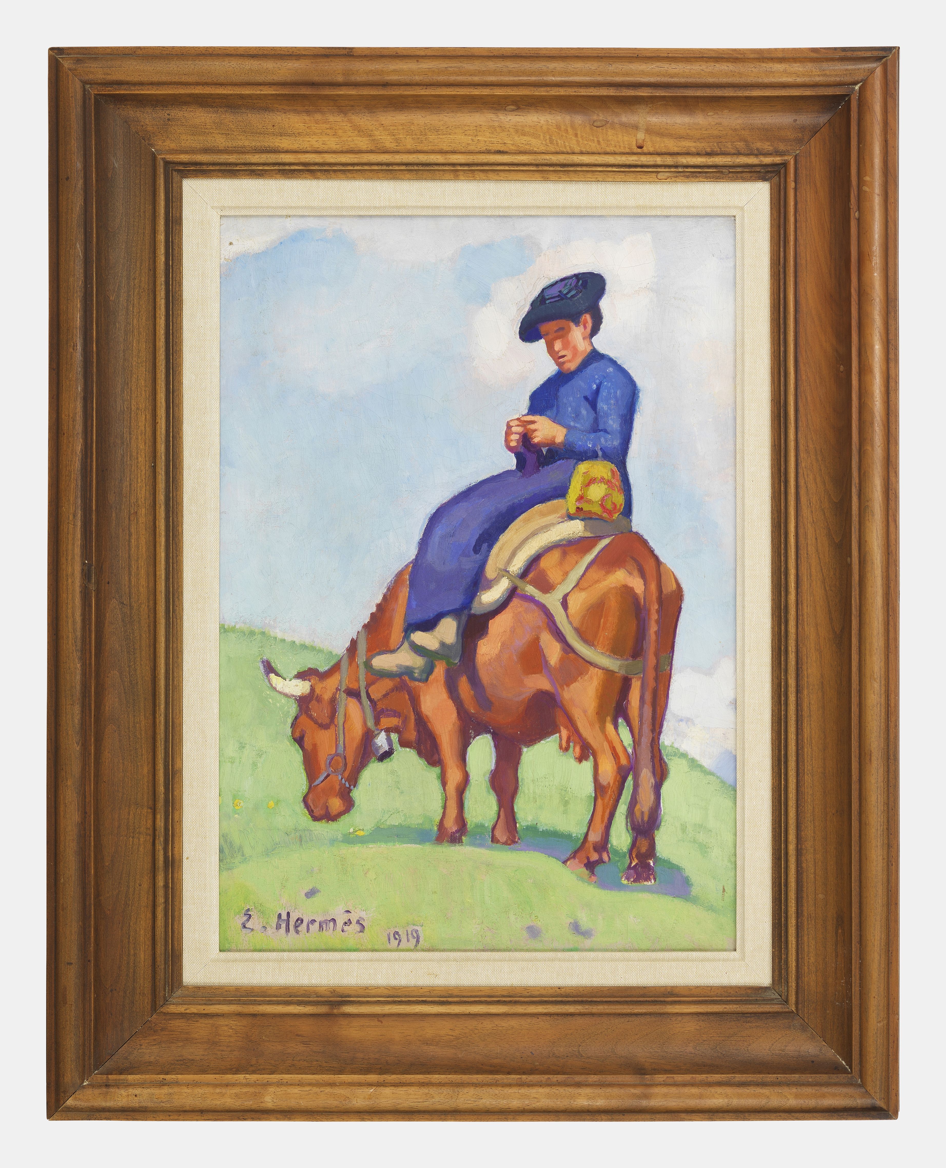La traite par le berger sur l'alpage en Valais, huile sur toile,...